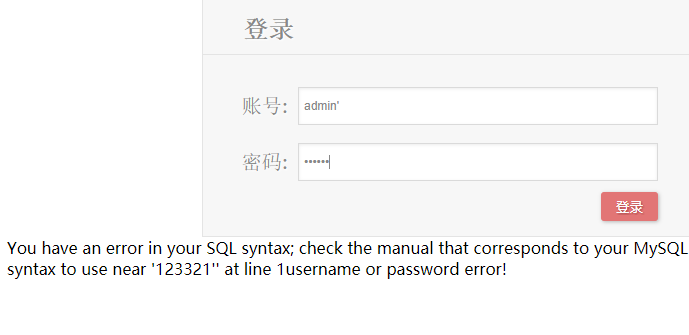 报错注入的前提是目标开启了错误显示,比如我们帐号输入admin',得到返回