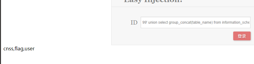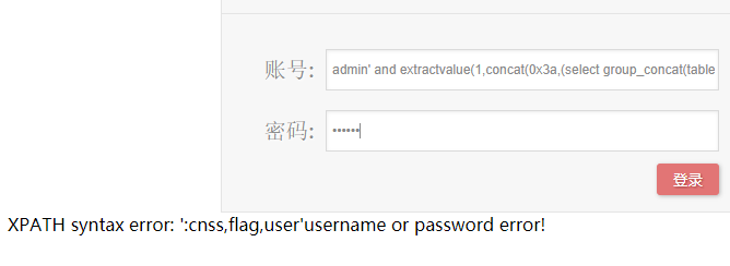 密码随意 如果返回的不为密码错误,就说明后面的表达式是成立的,由此判断出第一个表的第一个字符,通过改变substr 的第二个参数来获取完整表名,通过改limit来获取其他表(或者group_concat也可以,这里用的group_concat) 然后获得表名cnss,flag,user 然后同样