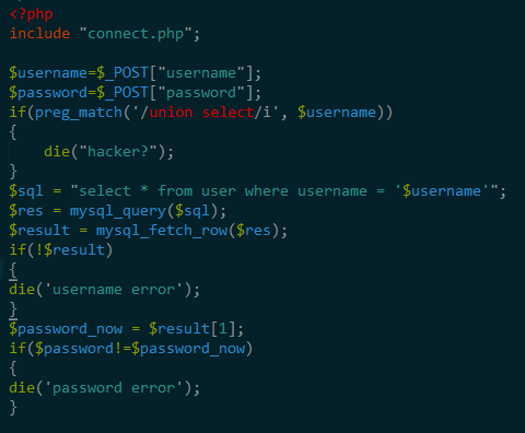其中正则只过滤了一个union select是因为我对这个印象比较深刻,是用括号绕过的,所以这里只写了这一个. 然后这个后台是用username来取数据,然后比对password,如果我们用union来提取的话,就可以绕过密码了, 就比如这道题,我们输入