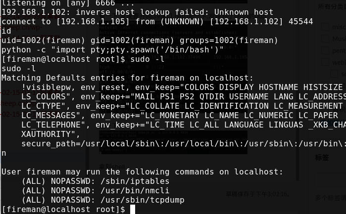 sudo -l发现tcpdump可以sudo执行 利用sudo执行反弹shell