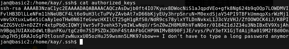 kay@basic2:~$ sudo -l Matching Defaults entries for kay on basic2: env_reset, mail_badpass, secure_path=/usr/local/sbin\:/usr/local/bin\:/usr/sbin\:/usr/bin\:/sbin\:/bin\:/snap/bin