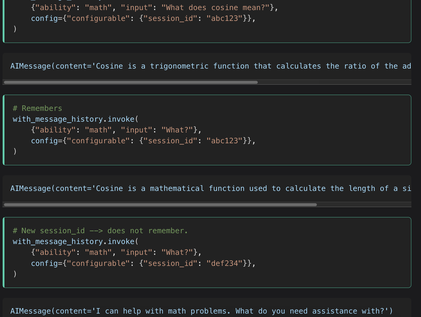 from langchain_core.chat_history import BaseChatMessageHistory from langchain_community.chat_message_histories import ChatMessageHistory from langchain_core.runnables.history import RunnableWithMessageHistory ### Statefully manage chat history ### store = {}