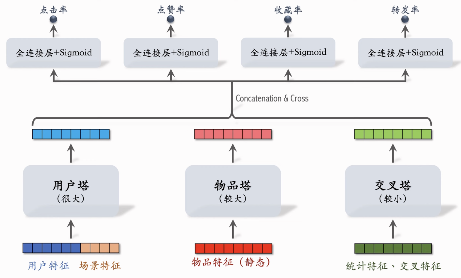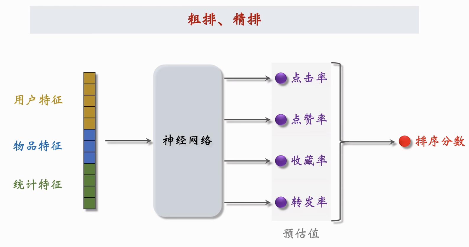 输入用户特征, 物品特征以及统计特征, 模型预测并输出相关指标, 最终我们对输出指标打分, 这个分数就作为最终排序分数.
