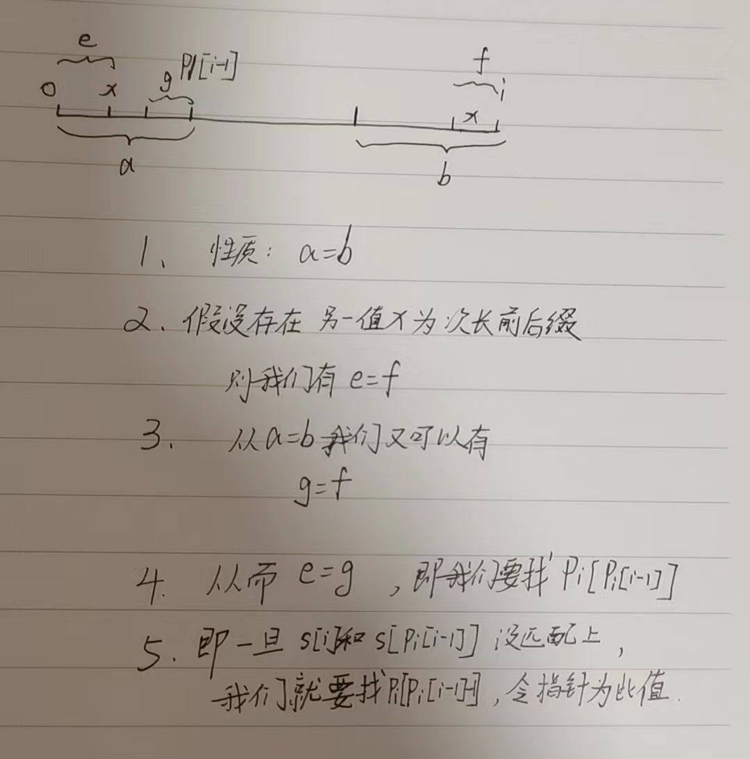 我们假设pi[i]为x, 假设我们最后找到了目标值, 我们有s[0]到s[x]和s[i-1-x]到s[i-1]相等, 此时